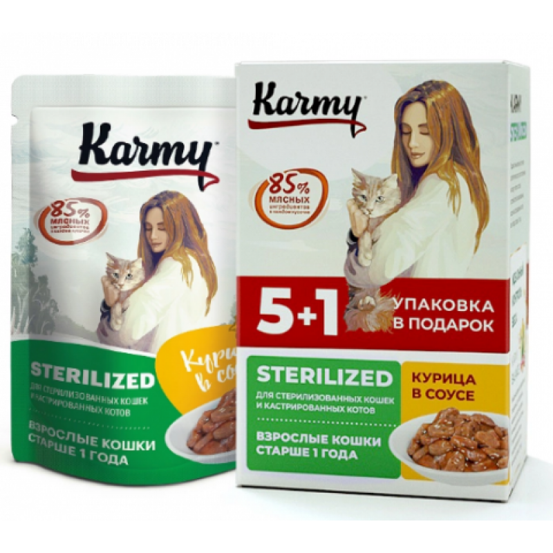 В зависимости от предпочтений кошки, вы можете кормить ее только влажным кормом или в сочетании с сухим кормом Karmy STERILIZED. Рекомендуемая суточная доза зависит от сезона, уровня активности и физиологических особенностей питомца. Состав: Мясо курицы, куриные субпродукты (печень, желудки), телятина, злаки, горох, растительная клетчатка, витамины и минеральные вещества, Омега-3 и Омега-6 жирные кислоты, таурин, L карнитин. 73 ккал/100 г Показатели питательной ценности: Белки - 9%, жиры - 3%, зола - 2,5%, клетчатка - 0,5%, влага - 82% Витамины и минеральные добавки: Витамин А - 90 МЕ, витамин D - 9 МЕ, витамин Е - 0,5 МЕ, Е1 железо - 1,4 мг, Е4 медь - 0,09 мг, Е5 марганец - 0,13 мг Условия хранения: хранить при t от -18 до +35 и относительной влажности воздуха не более 75%.