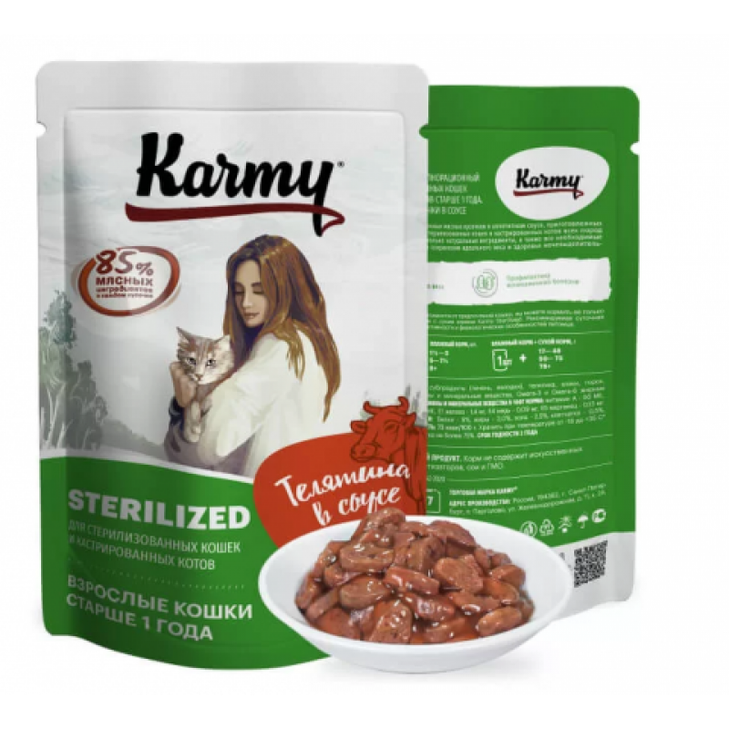 Karmy Sterilized - это порция сочных мясных кусочков в аппетитном соусе, приготовленных с учетом особых потребностей стерилизованных кошек и кастрированных котов всех пород старше 1 года. В составе корма только натуральные ингредиенты, а также все необходимые микроэлементы и витамины для сохранения идеального веса и здоровья мочевыделительной системы.